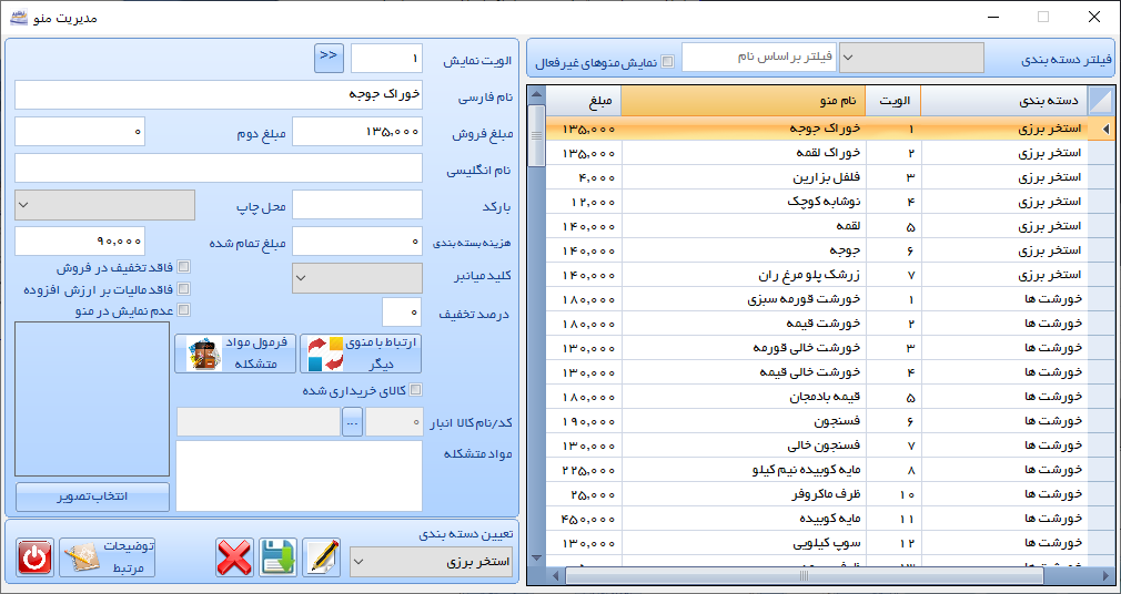 فرم مدیریت دسته بندی و گروه منوهای نرم افزار رستو.ران بی نظیر