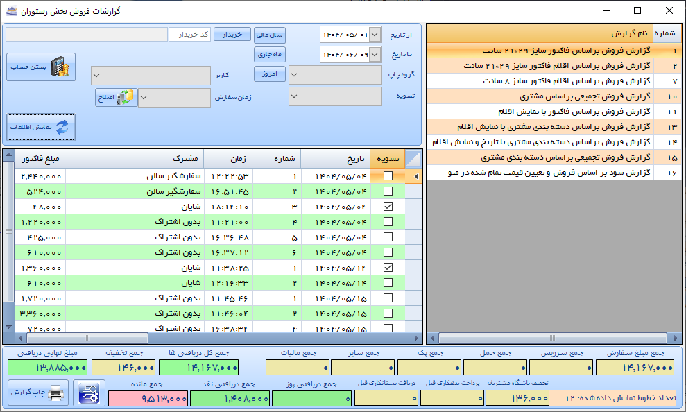 كليه گزارشات فروش براساس روزانه ، هفتگي ، ماهيانه ، ساليانه بر اساس فاكتور فروش و يا مشتري