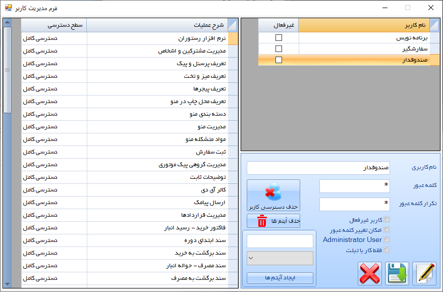 امکان تعریف کاربر و تعیین دسترسی برای جزئی ترین امکانات نرم افزار برای هر کاربر به صورت جداگانه